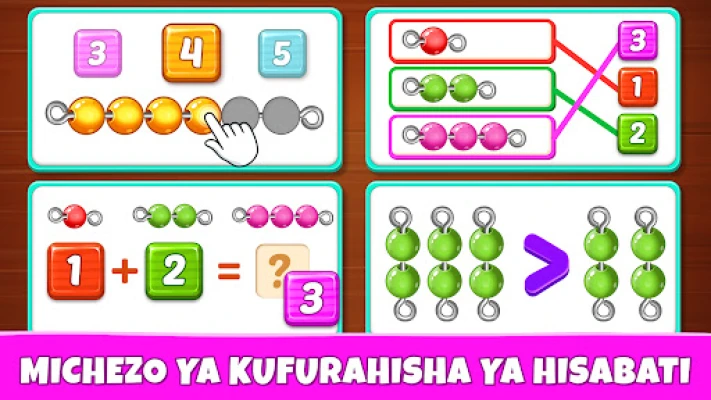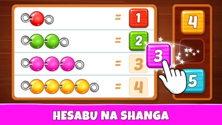 Ndani ya programu hii, utapata mbinu mbili kuu za kufundishia: "Hisabati yenye Shanga" na "Nambari za Kujifunza." Kipengele cha Hisabati yenye Shanga huwaruhusu watoto kuchunguza ulimwengu wa nambari na hesabu kupitia matumizi ya shanga, wakijifunza kuhesabu, thamani za mahali (umoja, makumi, mamia), na shughuli rahisi za kujumlisha na kutoa. Moduli ya Nambari za Kujifunza inasaidia kuimarisha utambuzi wa nambari kupitia michezo rahisi ya kulinganisha na kupanga, inayoweza kubadilishwa kulingana na umri wa mtoto wako. Mpangilio safi, wa rangi na wahusika rafiki huunda mazingira salama na ya kufurahisha. Wazazi wanaweza kufuatilia maendeleo kwa urahisi kupitia kadi za ripoti na kutazama watoto wao wakifungua vibandiko na vyeti maalum, yote bila matangazo ya nje wala ununuzi wa ndani ya programu.